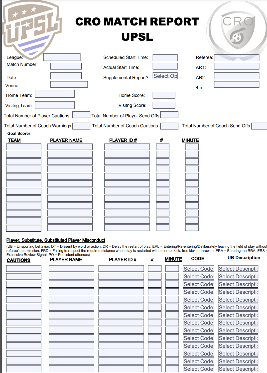 The Match Report is filled out by the Referee Crew and must be correct and include all information required for the league you are refereeing in.