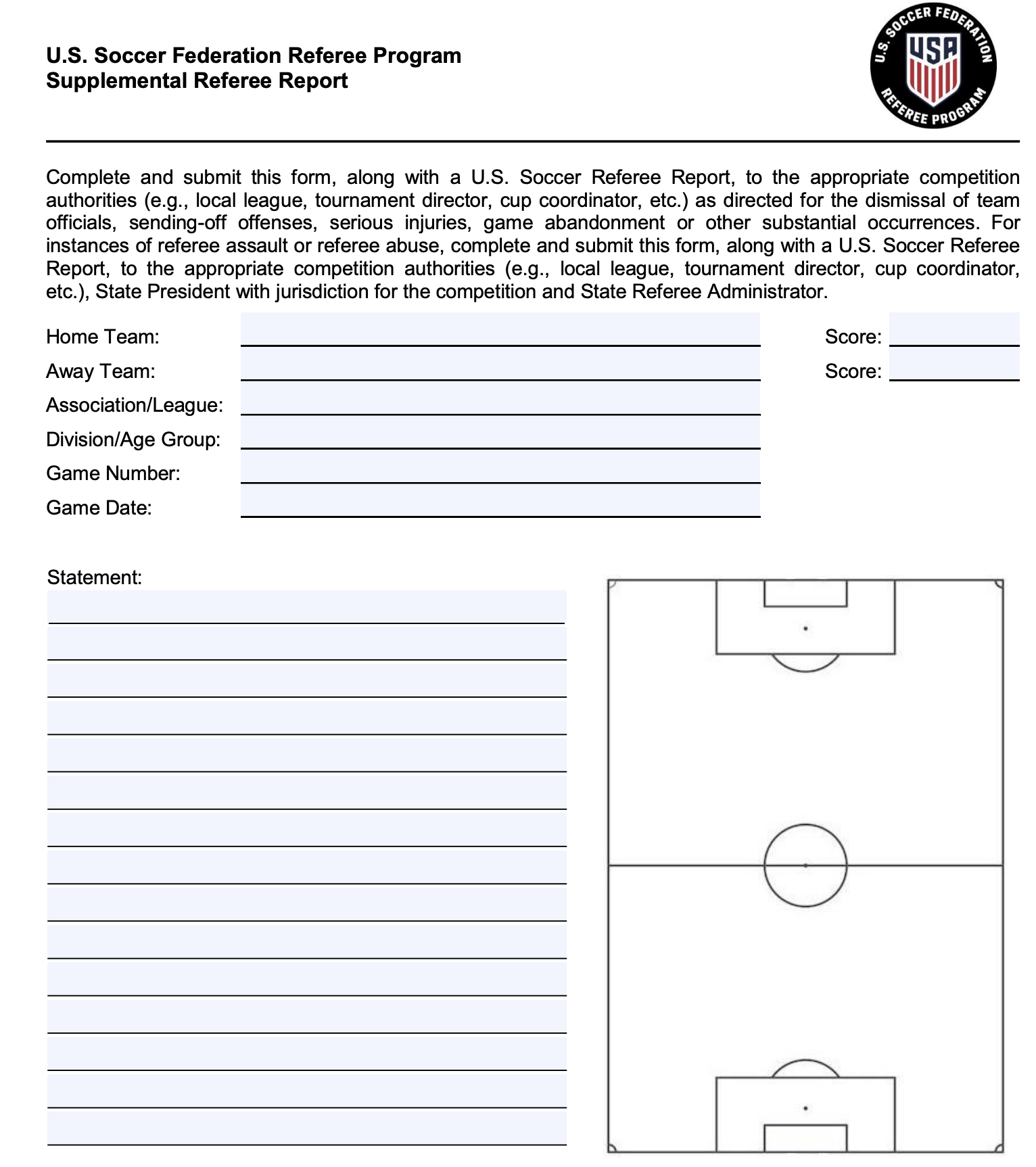 A Supplemental Report provides more detailed information about specific match incidents. This report will provide the league with additional information for any disciplinary actions that must take place or to fix issues with any match day requirements